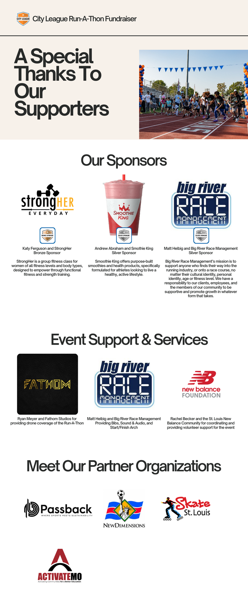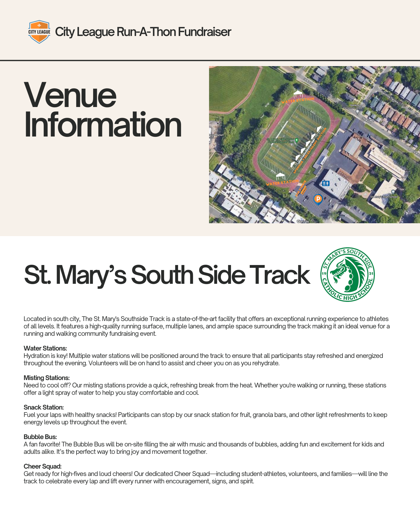 City League's 2nd Annual Run-A-Thon Fundraiser will be hosted on Thursday, October 9th at St. Mary's South Side High School Track from 5:30-7:30pm. Athletes of all abilities and ages can register individually or as part of a school or community team, and are encouraged to collect flat donations or pledges or for each lap they complete to support their school's athletic program or City League's mission. There will be an emcee, a DJ, a silent auction and sponsor booths to create a festive atmosphere. Awards will be given to the top fundraisers and runners.