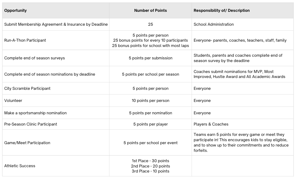 Points are tracked by the league. Schools may be asked to submit attendance sheets, survey completions, or brief forms after events. Updates will be shared regularly through league emails or an online leaderboard.